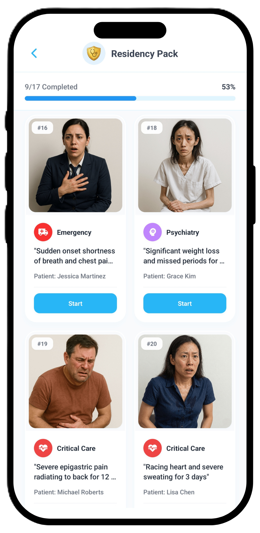 Questions are no longer just "What is the diagnosis?" They're "What is the next best step?" MedDiagnosis trains you to think through cases — from first presentation to full recovery.